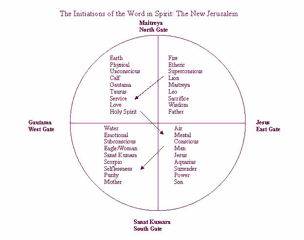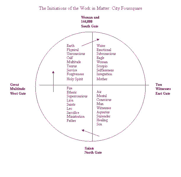I made the following two charts, based on the initiations described by Sanat Kumara on the Path of the Ruby, also posted at http://www.sanatkumara.online/ The first graph shows the initiations of the soul in Spirit on the four gates, and the light descending from spirit to matter. This represents the descent of the New Jerusalem that John saw, “coming out of heaven, prepared as a bride for her husband.” Notice the divine energy descending by initiation follows the lightning flash described in Kabbalah. The second chart depicts the divine energies of the soul in Matter on the four gates, as the initiations of the City Foursquare. Notice the energy flow follows the counterclockwise direction we also find in zodiac astrology.